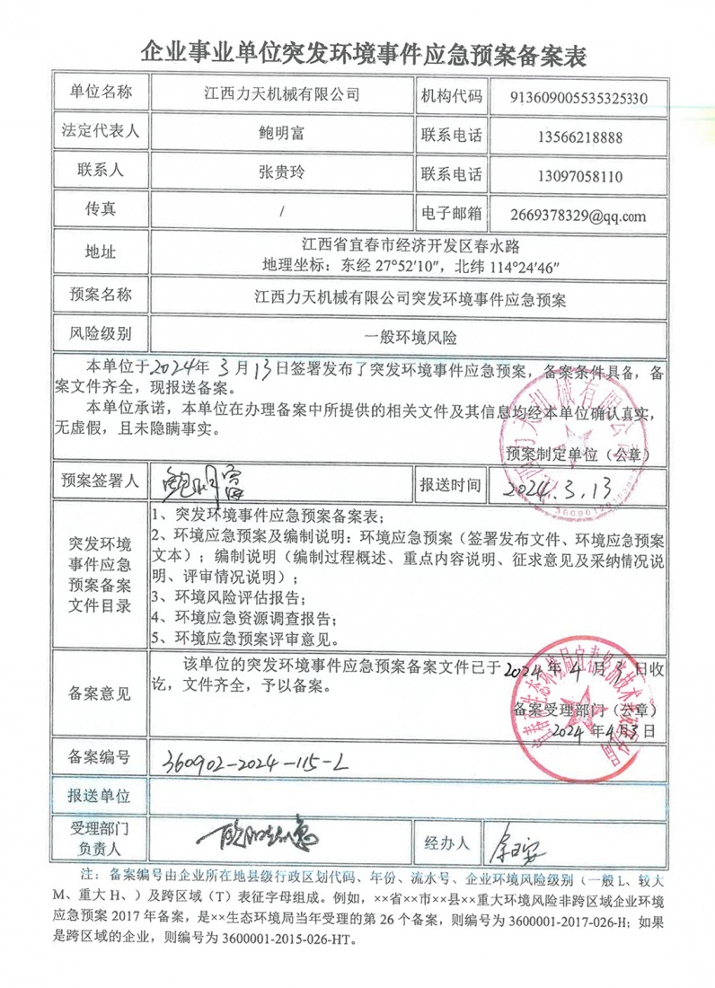 江西力天機械有限公司突發(fā)環(huán)境事件應急預案評審意見修改說明